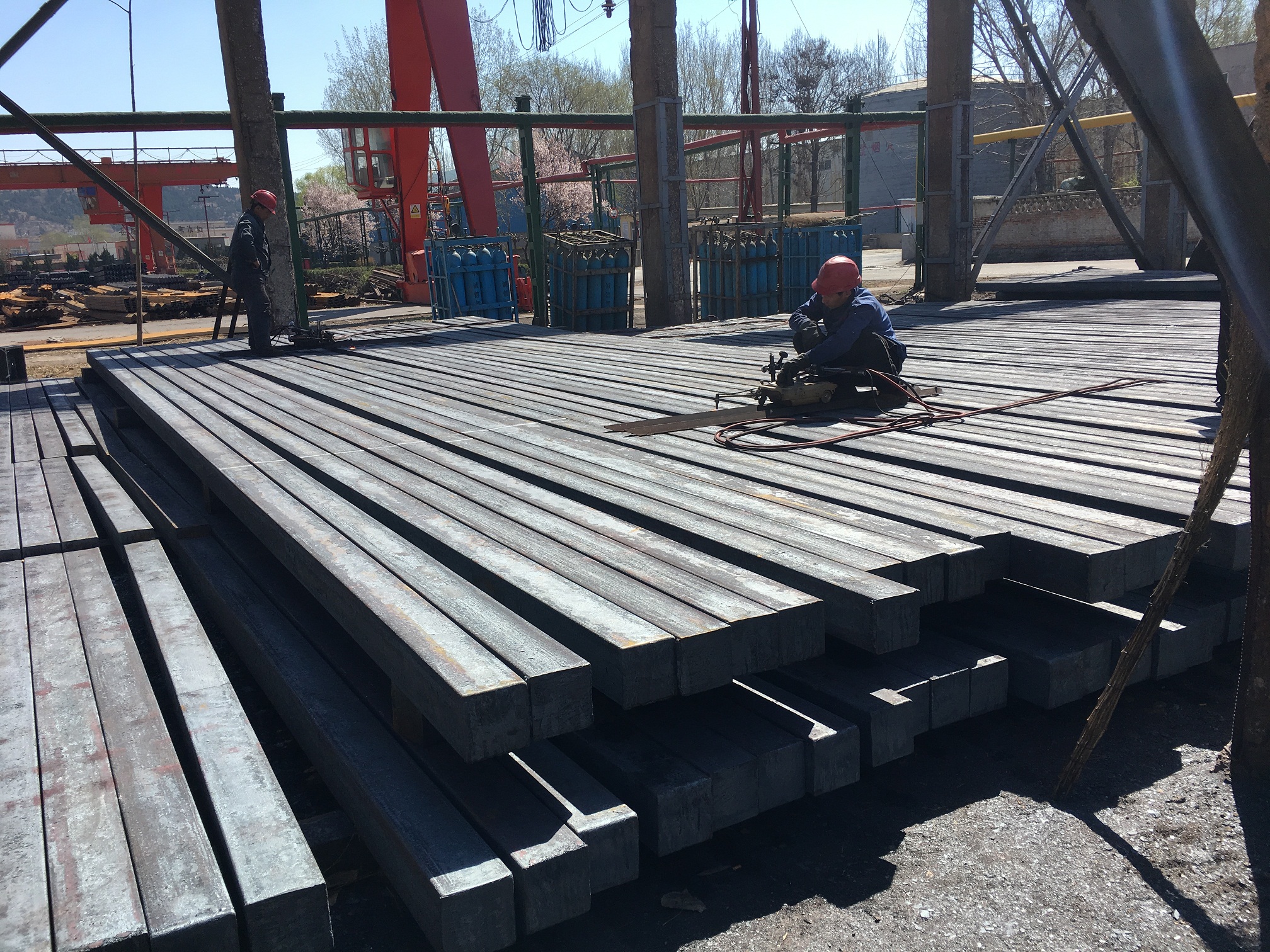 出了生產(chǎn)車間,映入眼簾的便是真正在等待加熱的鋼坯,鋼廠師傅們在測量計算投入的鋼坯量,與實際可出的型材量。這是等體積法的運用,可以更好的利用原材料,提高成材率。